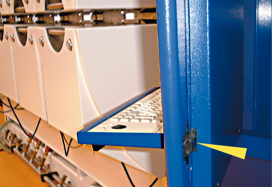 ACE rotary dampers protect the keyboard. To provide long term protection in arduous and often dirty industrial applications (and also to protect against unauthorized access) the machine keyboard is installed in a lockable and pivoted housing cabinet. ACE rotary dampers FRN-F1 were installed on the pivot axis to provide a smooth controlled motion to the keyboard as it is pulled down into its operating position. The damper also prevents overloading the hinge system and prevents damage to the keyboard, the housing cabinet and the hinges.
